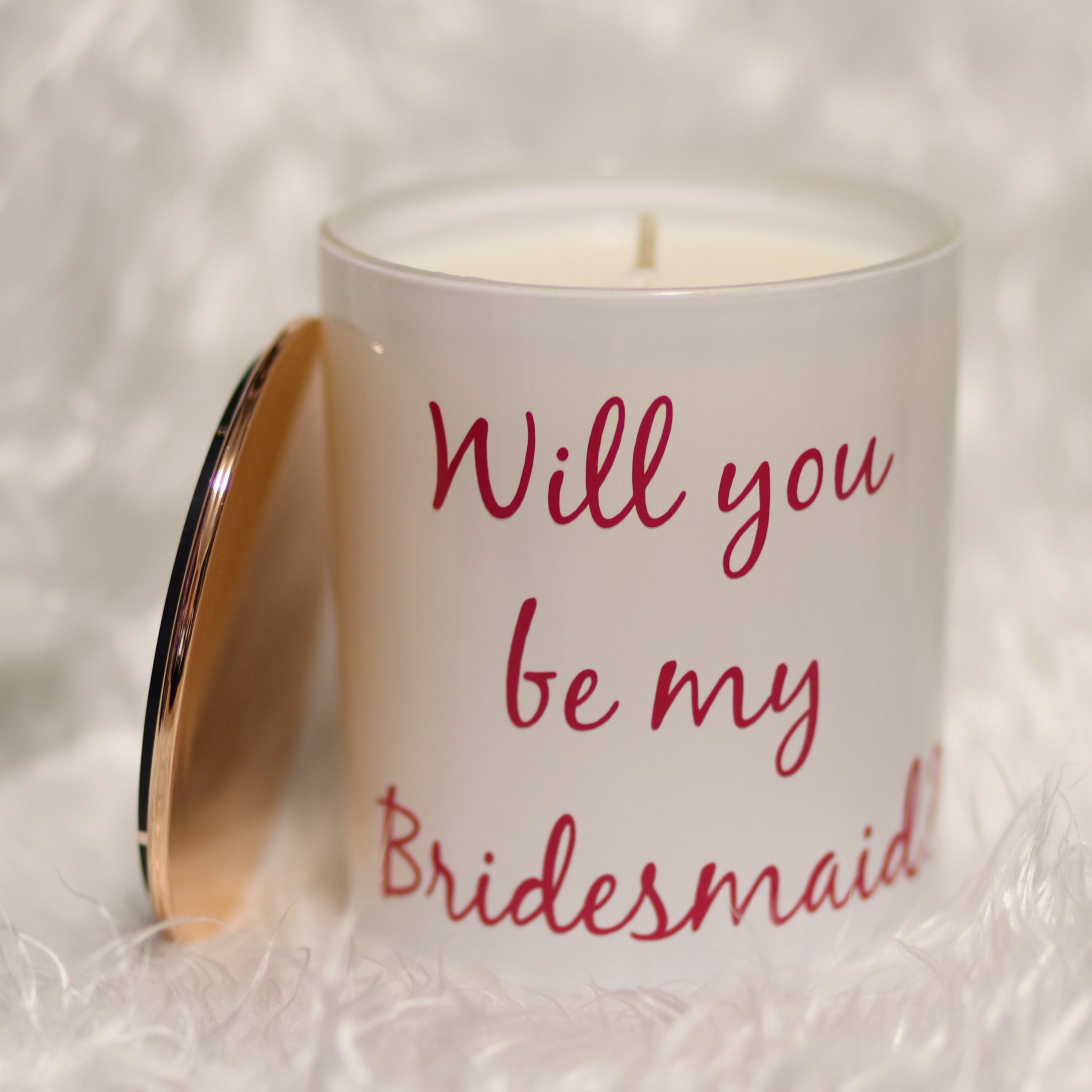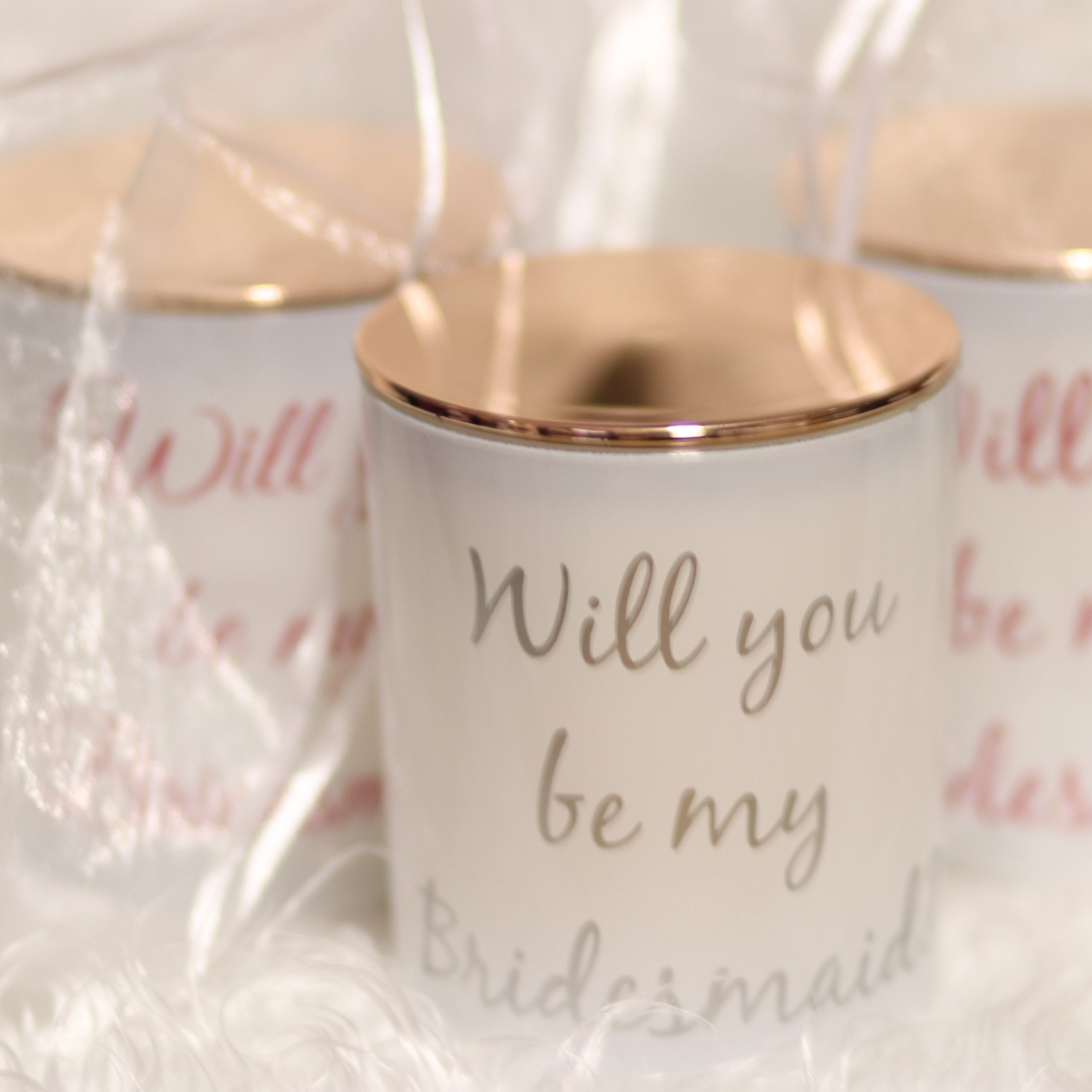 Milky white glass with a gold lid and beautiful “Will you be my Bridesmaid” label.